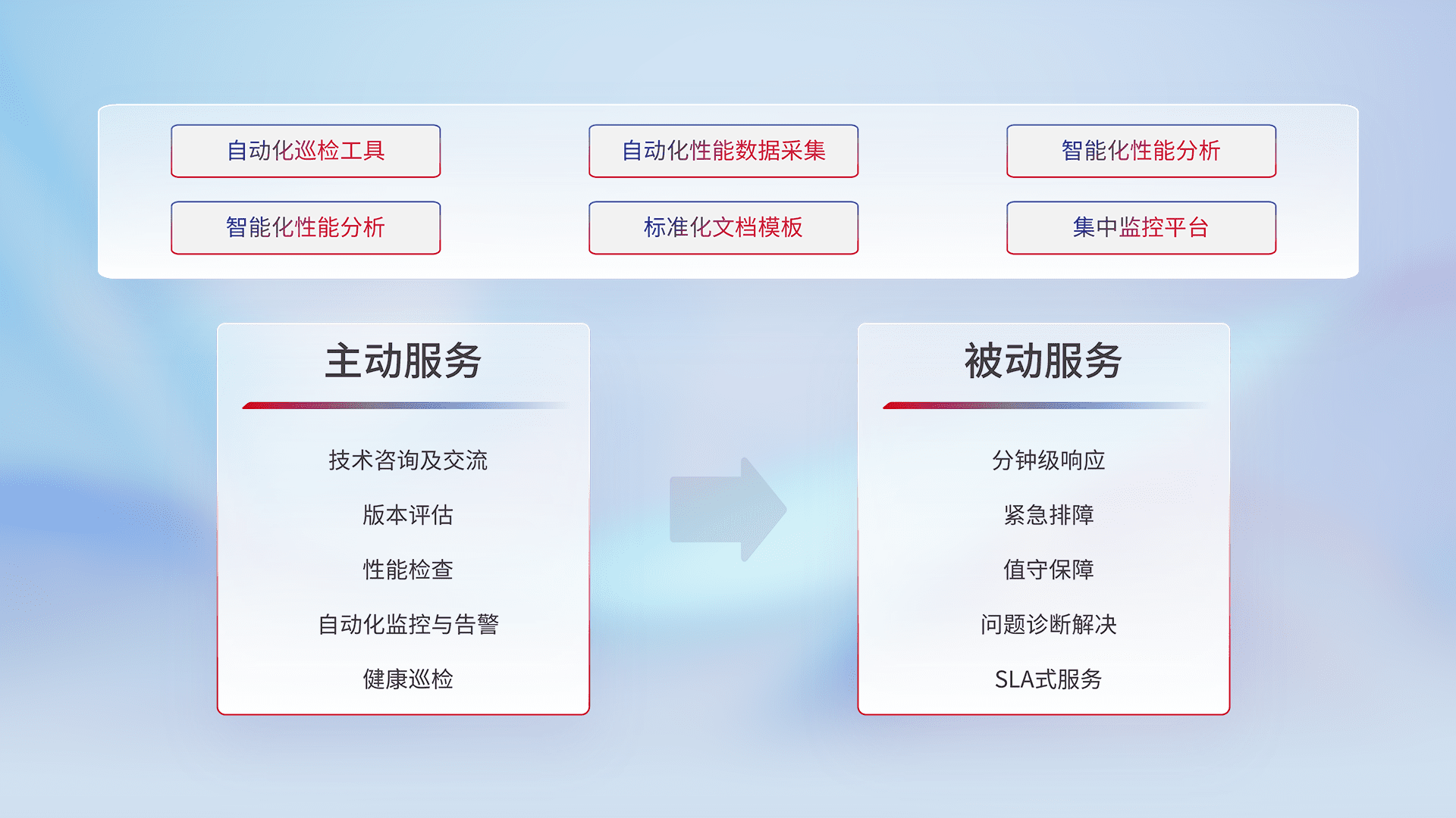 智能化工具和标准化文档,,,保障服务质量,,,,提供主动服务(包含技术咨询、、版本评估、、、性能检查、、、自动化监控与告警、、、、健康巡检)和被动服务包含(分钟级响应、、紧急排障、、、值守保障、、问题诊断解决、、、SLA服务)。。